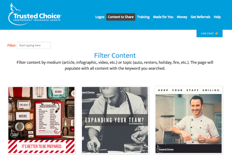 Trusted Choice® helps you reclaim that time through a recently expanded catalog of digital content. With access to even more graphics and articles in the Trusted Choice library of shareable content, your can easily download and share content directly with consumers through agency newsletters, blogs and social media.