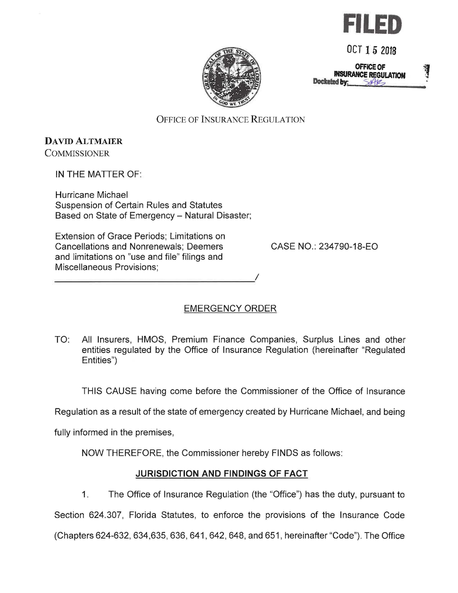 OIR Issues Emergency Order on Cancellations and Non-Renewals Related to Hurricane Michael